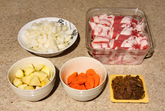 For this recipe, I am using thinly sliced pork belly, but you are free to use your protein of choice-- or even entirely omit it if you wish! I've used beef, hamburg steak, and even extra firm tofu in the past and all have turned out great ! For chicken, I recommend using thigh meat, because it's near impossible to overcook and doesn't get dry quickly like breast does. For this recipe, I recommend sticking with something you can just throw into the curry to cook through (thinly sliced pork belly, thinly sliced ribeye, extra firm tofu) Depending on the protein the prep will be different